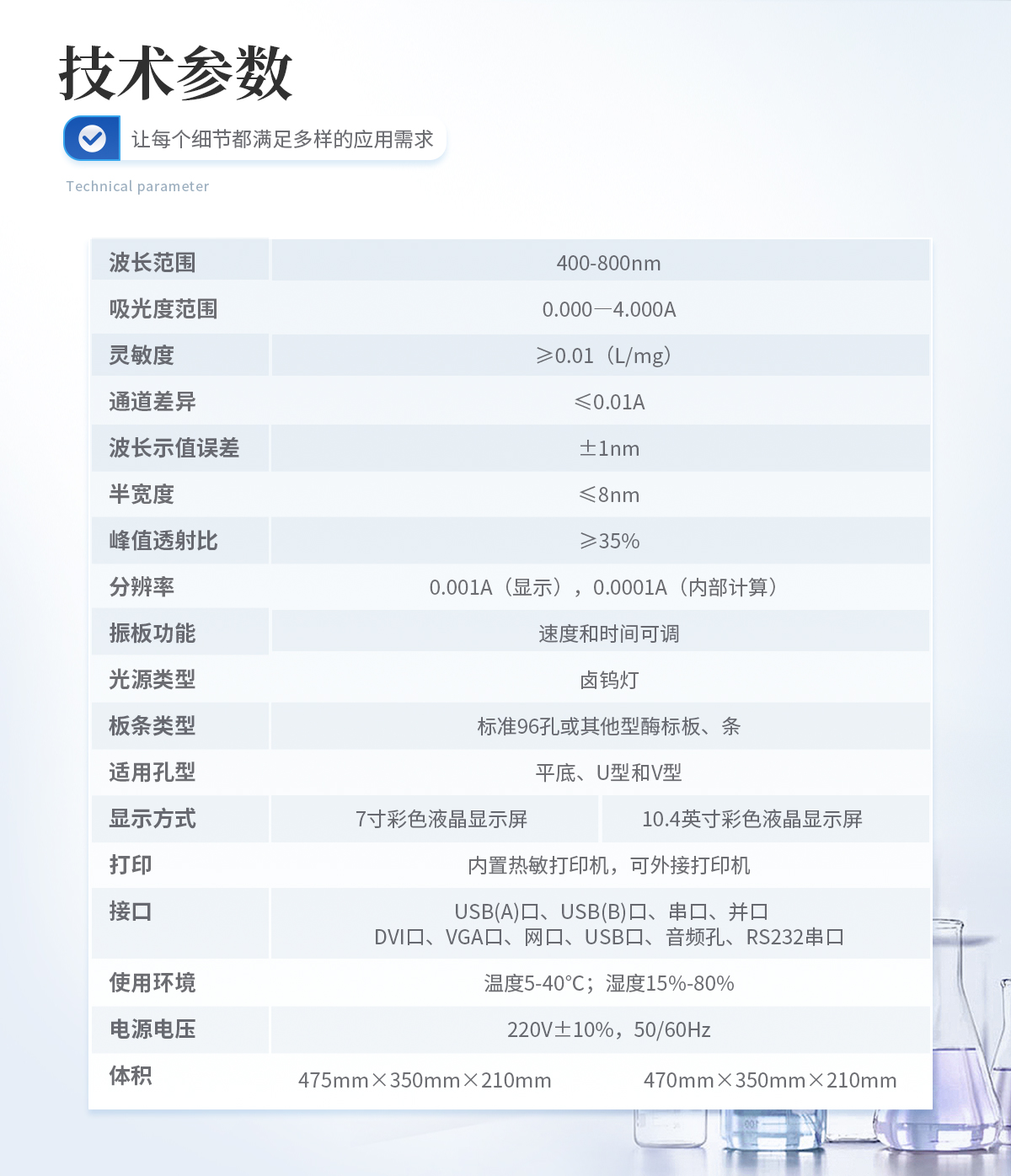 | 系統(tǒng):7英寸彩色觸摸屏,安卓系統(tǒng) | 讀數(shù)范圍 :0-4.000Abs | 濾光片帶寬:8~10nm | 分辨率:0.001Abs | 波長(zhǎng)范圍:340-750nm覆蓋整個(gè)可見光波長(zhǎng) | 線性范圍:0~3.0Abs,士1%; 3~4.0Abs, 土2% (@405nm) | 準(zhǔn)確性:士1% (0-3Abs) 士2% (3- 4Abs) (@405nm) | **性:CV≤0.2%(0-3Abs) CV≤1.0%(3- 4Abs)標(biāo)準(zhǔn)測(cè)量模式 (@405nm) | 濾光片:8片濾光片輪,標(biāo)配4塊濾光片; 405nm,450nm,492nm,630nm,另可選; 配340nm-750nm波長(zhǎng)濾光片 | 測(cè)量速度: (<6s, 96=""> | 內(nèi)存:可存儲(chǔ)200個(gè)測(cè)量程序和10萬個(gè)測(cè)結(jié)果(96孔板) | 接口:3個(gè)USB接口,分別用于連接電腦,打印機(jī)和U盤掃碼槍 | 光源:6V10W鹵素?zé)?,壽命可達(dá)2000h | 外形尺寸:W440mm×D295mm×H225mm | 電源:AC100-240V, 50-60Hz, 2A | 凈重:10kg |